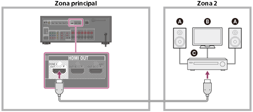 - Para usar essa conexão, defina [Zone2 Out] no menu HDMI Settings como [On].