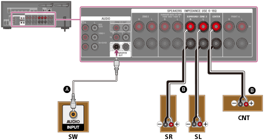 Conecte las tomas en el lado Lo (o Hi) de los altavoces delanteros a los terminales SPEAKERS FRONT A y conecte las tomas en el lado Hi (o Lo) de los altavoces delanteros a los terminales SPEAKERS SURROUND BACK/BI-AMP/FRONT HIGH/FRONT B.