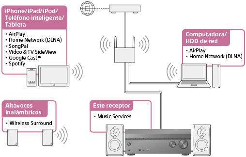Puede disfrutar reproduciendo contenido de audio en alta calidad desde una computadora o HDD de red, o un iPhone/iPad/iPod u otro smartphone o tableta conectados a su red doméstica inalámbrica o con cables.