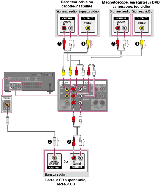Raccordez les appareils à l’ampli-tuner, comme illustré ci-dessous.