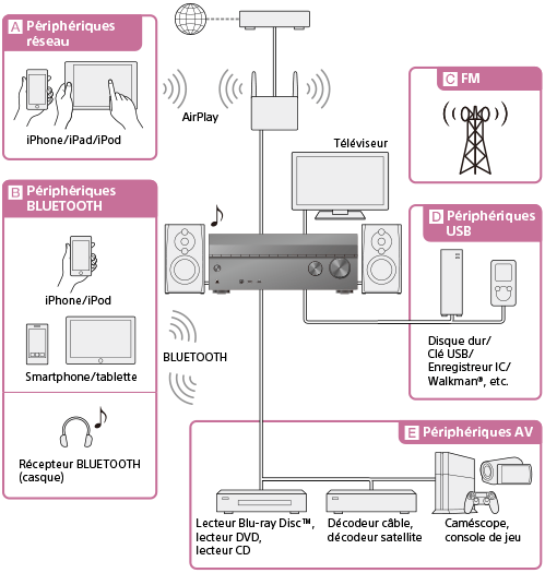 Par exemple, vous pouvez utiliser plusieurs appareils avec cet ampli-tuner, comme illustré ci-dessous.