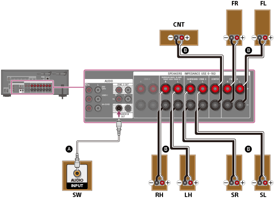 Pour en savoir plus sur la méthode de raccordement des câbles d’enceinte à l’ampli-tuner, reportez-vous à « Méthode de connexion des câbles des enceintes ».