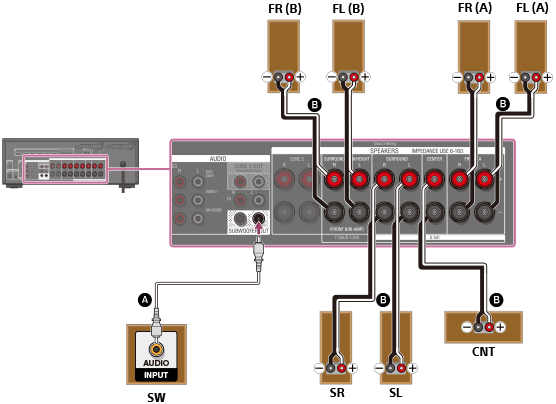 Conexión de un sistema de altavoces de 5.1 canales con conexión de altavoces B delanteros