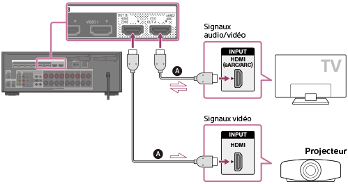 - Si la prise HDMI OUT A (TV) de votre ampli-tuner est étiquetée « ARC », mettez à jour le logiciel de l’ampli-tuner. Pour en savoir plus, reportez-vous à « Mise à jour du logiciel (Software Update) ». Si la prise HDMI OUT A (TV) de votre ampli-tuner est étiquetée « eARC/ARC », son logiciel prend déjà en charge la fonction eARC.