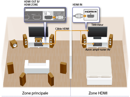 Vous pouvez profiter de la vidéo et de l’audio dans une autre pièce en raccordant un téléviseur ou un autre récepteur AV doté d’une prise d’entrée HDMI et situé dans une autre pièce à la prise HDMI OUT B/HDMI ZONE. Par exemple, il est possible de lire des films ou de la musique provenant d’un périphérique AV dans le salon en haute qualité dans une chambre.