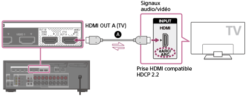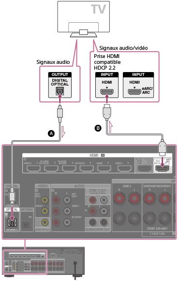 Pour regarder du contenu protégé HDCP 2.2 tel que du contenu 4K, raccordez ces prises HDMI à des prises qui prennent en charge HDCP 2.2 sur le téléviseur et le périphérique AV. Pour obtenir des informations détaillées permettant de savoir si le téléviseur et le périphérique AV sont dotés d’une prise HDMI compatible HDCP 2.2, reportez-vous au mode d’emploi de l’appareil raccordé.