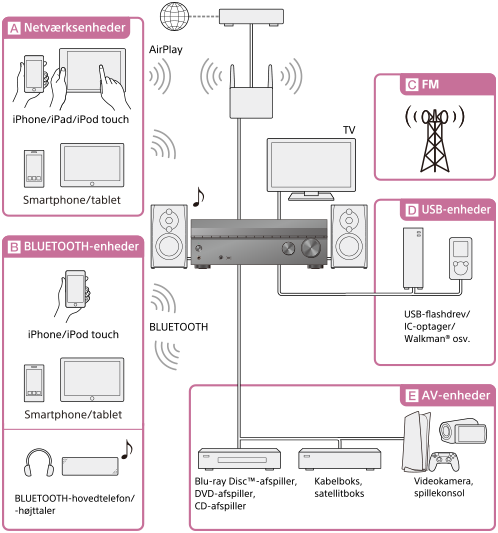 Du kan sende indhold som f.eks. lyd fra en iPhone/iPad/iPod touch eller anden smartphone/tablet til enheden via netværket.