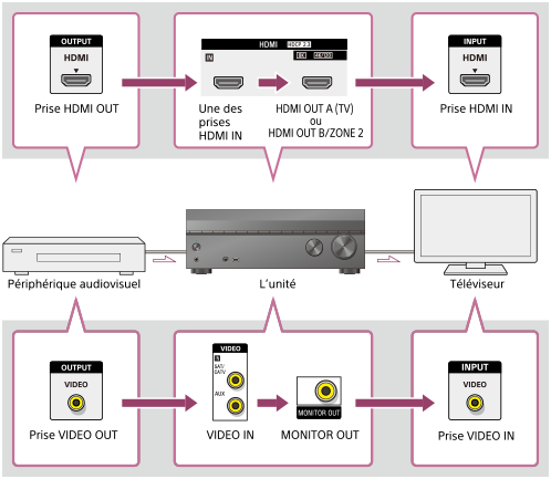 Les signaux vidéo numériques reçus par les prises HDMI IN de cette unité sont reproduits à partir des prises HDMI OUT A (TV) ou HDMI OUT B/ZONE 2 uniquement. Les signaux vidéo analogiques entrant depuis les prises VIDEO IN sont reproduits à partir de la prise MONITOR OUT seulement.
