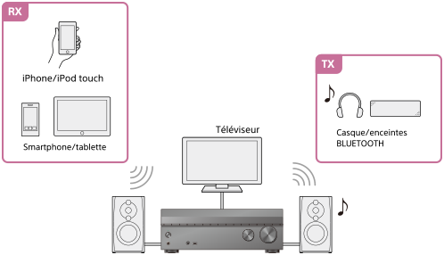 Vous pouvez profiter d’un contenu audio/musical stocké sur votre iPhone/iPod touch, smartphone ou tablette qui prend en charge la fonction BLUETOOTH en l’envoyant à l’unité.