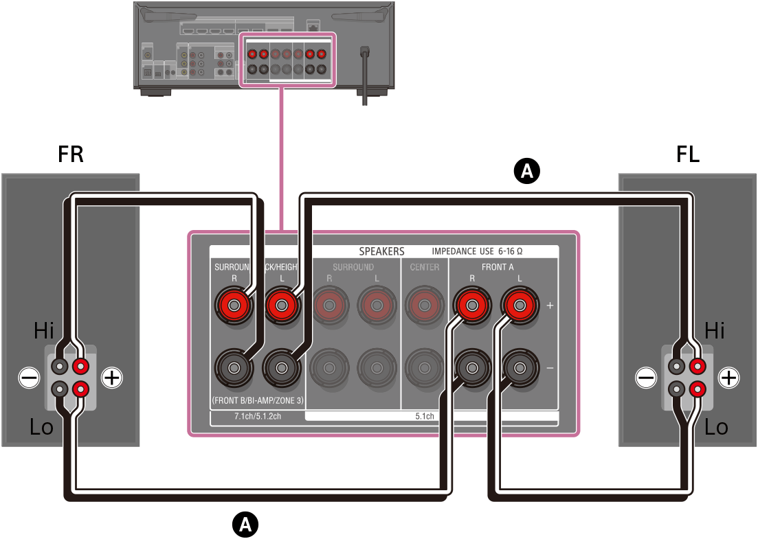 Ligue as tomadas do lado Lo (ou Hi) dos altifalantes frontais aos terminais SPEAKERS FRONT A e ligue as tomadas do lado Hi (ou Lo) dos altifalantes frontais aos terminais SPEAKERS SURROUND BACK/HEIGHT (FRONT B/BI-AMP/ZONE 3) da unidade.