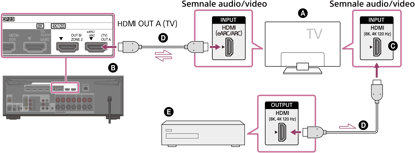 Dacă mufa de intrare HDMI compatibilă eARC/ARC a televizorului nu acceptă formatul video 8K, nu puteți transmite conținutul video la calitate originală prin cablul HDMI, chiar dacă conectați la unitate un dispozitiv AV care acceptă formatul video 8K. În acest caz, stabiliți o conexiune și o setare în felul următor.