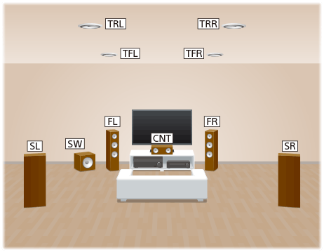Esta instalación de altavoces se configura añadiendo altavoces delanteros superiores y altavoces traseros superiores al sistema de altavoces de 5.1 canales colocados a nivel del oyente. Para los altavoces traseros superiores se utiliza un amplificador de potencia estéreo adicional.