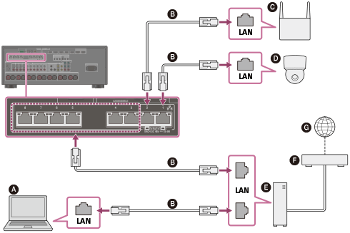- Connectez un routeur à l’un des ports 1 à 8 de l’ampli-tuner à l’aide d’un seul câble LAN. Ne connectez pas le même routeur sur l’ampli-tuner à l’aide de plus d’un câble LAN. Cela pourrait provoquer un dysfonctionnement.