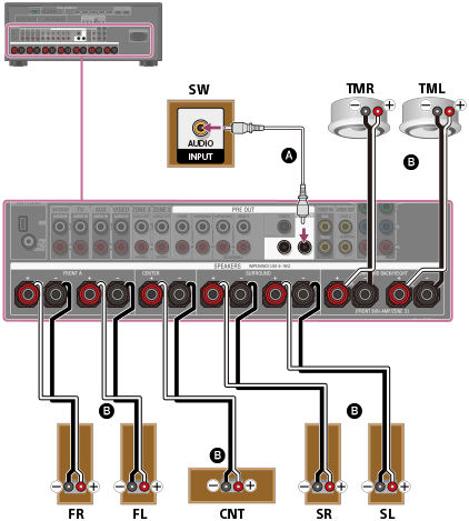 - Après avoir installé et raccordé vos enceintes, réglez le modèle d’enceintes sur [5.1.2 (TM)] à l’aide de [Speaker Pattern] dans le menu [Speaker Setup].