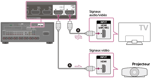 - Si la prise HDMI OUT A de votre ampli-tuner est libellée « ARC », mettez à jour le logiciel sur l’ampli-tuner. Pour en savoir plus, reportez-vous à « Mise à jour du logiciel via le réseau (Network Update) » ou « Mise à jour du logiciel à l’aide d’une clé USB (USB Update) ». Si la prise HDMI OUT A de votre ampli-tuner est libellée « eARC/ARC », c’est que son logiciel prend déjà en charge la fonction eARC.
