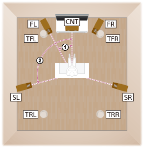 Cette installation d’enceintes est configurée par ajout d’enceintes avant supérieures et arrière supérieures à un système d’enceintes 5.1 canaux placé au niveau de l’auditeur. Un amplificateur de puissance stéréo supplémentaire est utilisé pour les enceintes arrière supérieures.