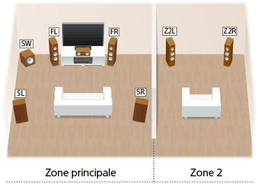 Vous pouvez profiter simultanément de l’audio dans une autre pièce en raccordant les enceintes situées dans l’autre pièce aux bornes SPEAKERS SURROUND BACK/HEIGHT (FRONT B/BI-AMP/ZONE 2). Par exemple, vous pouvez écouter la même musique provenant d’un périphérique AV situé dans le salon à la fois dans le salon et la cuisine, ou regarder un film dans le salon alors que de la musique provenant d’un périphérique différent est lue dans la cuisine.