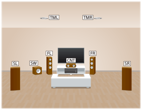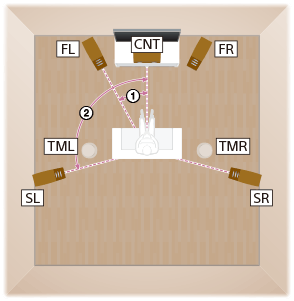Cette installation d’enceintes est configurée par ajout d’enceintes centrales supérieures à un système d’enceintes 5.1 canaux placé au niveau de l’auditeur.