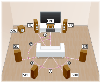 Cette installation d’enceintes est configurée par ajout d’enceintes surround arrière à un système d’enceintes 5.1 canaux placé au niveau de l’auditeur.