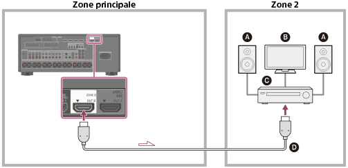 Les signaux d’entrée audio/vidéo HDMI et les signaux d’entrée audio optiques/coaxiaux sont reproduits dans la Zone 2 à l’aide de la prise HDMI OUT B (ZONE 2) de l’ampli-tuner.