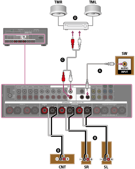 Si un modèle d’enceinte dans lequel les enceintes ne sont pas raccordées aux bornes SPEAKERS SURROUND BACK/HEIGHT(FRONT B/BI-AMP/ZONE 2) est sélectionné, vous pouvez raccorder des enceintes avant à ces bornes pour une connexion de bi-amplificateur. Raccordez chaque enceinte comme illustré ci-dessous.