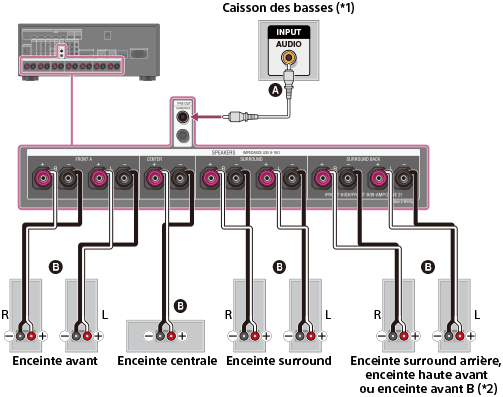 *2 Remarques relatives aux raccordements sur les bornes SPEAKERS SURROUND BACK/FRONT HIGH/FRONT B/BI-AMP/ZONE 2