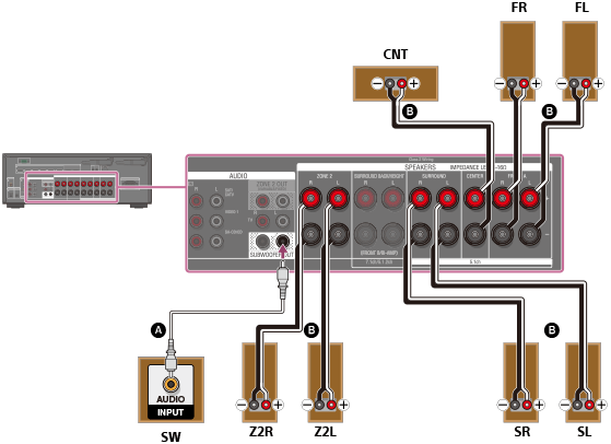 Después de haber hecho la conexión de la zona 2, ajuste [SURROUND BACK/ZONE2 Priority] a [ZONE2 Terminals] en el menú [Speaker Settings].