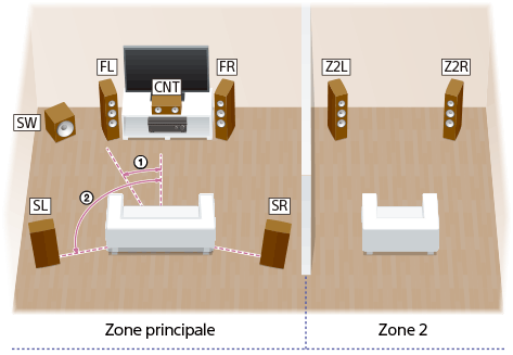Pour pleinement profiter d’un son surround multicanal cinéma, vous avez besoin de cinq enceintes (deux enceintes avant, une enceinte centrale et deux enceintes surround) et d’un caisson de graves. Vous pouvez également profiter de l’audio dans un autre emplacement (« Zone 2 ») en raccordant les enceintes Zone 2 supplémentaires. Par exemple, il est possible d’écouter de la musique reçue de services musicaux dans la Zone 2 tout en profitant d’un DVD dans la zone principale.