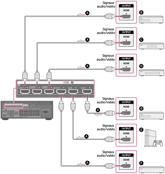 - Cette connexion HDMI est un exemple. Vous pouvez raccorder chaque appareil HDMI à l’une des entrées HDMI.