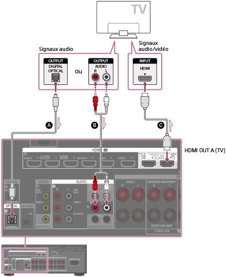 Avec un seul câble de connexion HDMI, vous pouvez écouter le son du téléviseur des enceintes raccordées à l’ampli-tuner bien que ce dernier envoie le son et la vidéo vers le téléviseur.