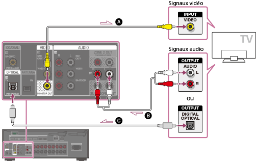 ), l’ampli-tuner peut reproduire des signaux audio et vidéo au téléviseur. Toutefois, notez que vous devez également connecter le câble optique numérique (