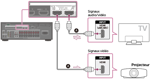 - Raccordez un moniteur de téléviseur ou un projecteur à la prise HDMI OUT A (TV), HDMI OUT B/HDMI ZONE ou MONITOR OUT de l’ampli-tuner.