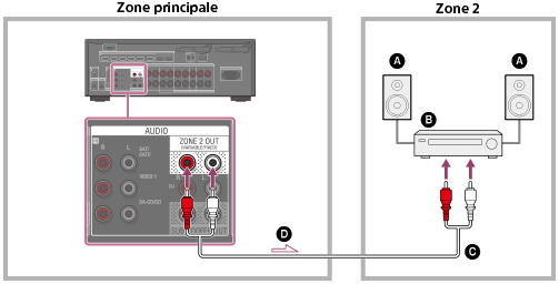 Vous pouvez profiter du son d’un appareil raccordé à l’ampli-tuner dans une zone différente de la zone principale. Par exemple, vous pouvez regarder un DVD dans la zone principale et écouter de la musique reçue à partir de services musicaux dans la Zone 2.