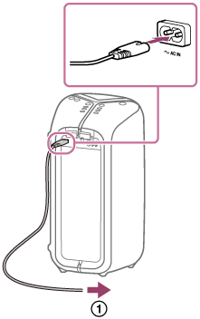 Притиснете силно края на кабела за мрежово захранване (доставен) към AC IN жака в задната част на системата и след това го включете в мрежов контакт (