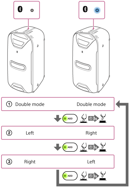 Om du använder två system, kan du växla mellan dubbelt läge, där samma ljud spelas upp på båda systemen, och stereoläge, där ett system återger det vänstra kanalljudet och det andra systemet återger det högra kanalljudet för uppspelning i stereo.