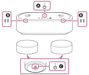 | Bliká (oranžová) | Pokud je zadní reproduktor zapnutý, když zbývající kapacita vestavěné dobíjecí baterie předního reproduktoru klesne pod 1 %, indikátor třikrát zabliká a zadní reproduktor se vypne. |