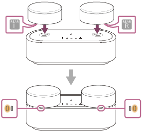 Pokud je vestavěná baterie plně nabitá, když umístíte zadní reproduktor na přední reproduktor, indikátor nabíjení zadního reproduktoru se rozsvítí oranžově a po několika sekundách zhasne.