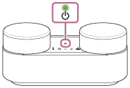- Když uslyšíte hlasové pokyny (Rear speaker is Low Battery. (Zadní reproduktor má téměř vybitou baterii.)) a indikátor stavu zadního reproduktoru po zapnutí reproduktorového systému začne pomalu blikat oranžově, baterie zadního reproduktoru je vybitá. Nabijte zadní reproduktor.