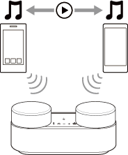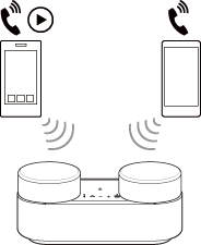 - Chcete-li přehrávat hudbu na dalším (druhém) zařízení ve vícebodovém připojení, spusťte přehrávání hudby pomocí druhého zařízení. V závislosti na podmínkách můžete stále poslouchat hudbu přehrávanou na stejném (prvním) zařízení z reproduktorového systému po spuštění přehrávání z druhého zařízení. V takovém případě můžete poslouchat hudbu přehrávanou na druhém zařízení, a to zastavením přehrávání na prvním zařízení.