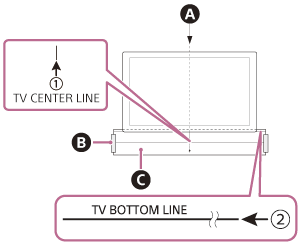 ЦЕНТРАЛНА ЛИНИЯ НА ТЕЛЕВИЗОРА”, отпечатана на ШАБЛОН ЗА МОНТИРАНЕ НА СТЕНА (предоставен), с центъра на широката част на телевизора ви.