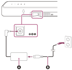 Podłącz zasilacz sieciowy (w zestawie) i przewód zasilający (w zestawie) do terminala DC IN głośnika Bar Speaker, a następnie podłącz przewód do gniazdka zasilania.