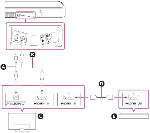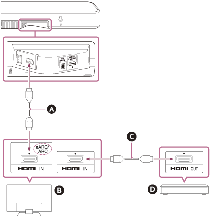 Anslut HDMI-uttaget som är kompatibelt med eARC/ARC på TV:n till HDMI OUT (TV (eARC/ARC))-uttaget på högtalarsystemet via HDMI-kabeln (medföljer).