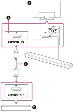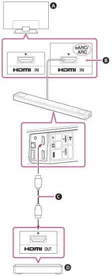 เชื่อมต่อช่องเสียบ HDMI IN บนระบบลำโพงและช่องเสียบ HDMI OUT บนอุปกรณ์ AV ด้วยสาย HDMI (ไม่ได้ให้มา)
