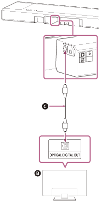Anslut det optiska digitalutgångsuttaget på TV:n till TV IN (OPT)-uttaget på ditt högtalarsystem via en optisk digitalkabel (medföljer ej).
