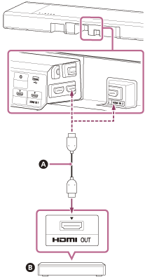 使用HDMI线缆(未提供)连接AV设备上的HDMI OUT插孔和扬声器系统上的HDMI IN 1或HDMI IN 2插孔。