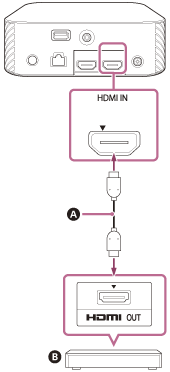 Anslut HDMI OUT-uttaget på AV-enheten till HDMI IN-uttaget på högtalarsystemet via en HDMI-kabel (medföljer ej).