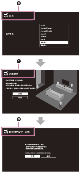 - 视打开电视机和扬声器系统的顺序而定,扬声器系统可能会被静音,并且在扬声器系统的前面板显示屏中显示[MUTING]。如果发生这种情况,关闭所有设备,先打开电视机,然后再打开扬声器系统。