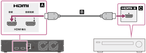 通过HDMI输入插孔使用高速HDMI电缆(未随附)将影音接收器连接至4K 媒体播放器,如下图所示。
