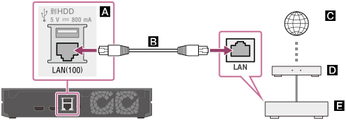 如下图所示,通过有线LAN连接将4K 媒体播放器连接至互联网。