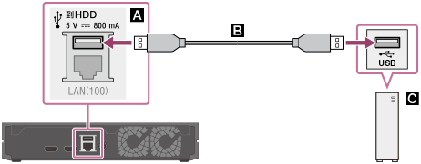 如下图所示,将外部硬盘驱动器连接至4K 媒体播放器背面的到HDD
